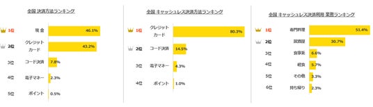 - 決済方法は、現金が46.1%で前月に引き続き第1位となった。2位のクレジットカードは43.2%とその差は2.9ptで前月よりも離される結果となった。キャッシュレス決済の内訳は、クレジットカードが80.3%、次いでコード決済が14.5%となった。業態別で見ると、キャッシュレス決済利用が最も多いのは専門料理で、前月から0.8pt増加し、51.4%となった。
