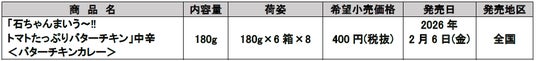 平和食品工業株式会社は、市販用レトルトカレー「石ちゃんまいう~!! トマトたっぷりバターチキン」中辛<バターチキンカレー>を2月6日より全国で新発売 します。昨年発売の「石ちゃんまいう~!! もーもーカレー」「石ちゃんまいう~!! ぶーぶーカレー」に引き続き、石ちゃんまいう~!!カレーシリーズ3品目として新登場!トマトのコクと酸味のバランスにこだわった一品です。パスタにもごはんにも相性バッチリなバターチキンカレーです。