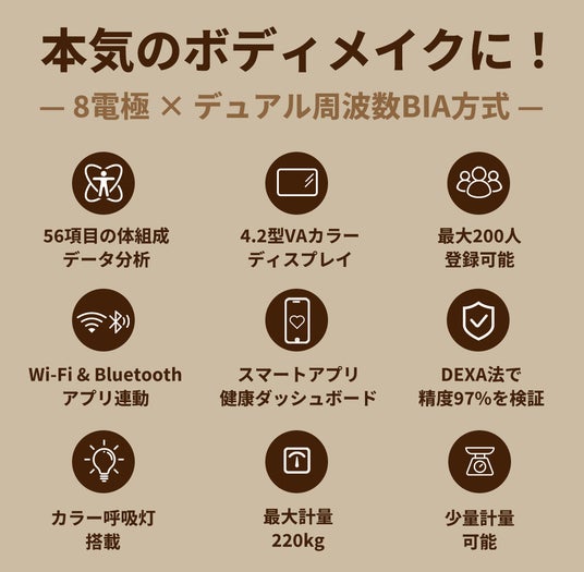 体重や体脂肪だけでなく、筋肉量・内臓脂肪レベル・水分量・タンパク質量など、多角的なデータを測定。
