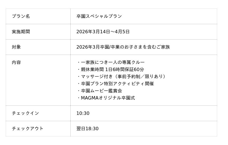 株式会社MAGMA(本社:東京都渋谷区、代表取締役:福永祐大)が運営する体験型リゾートホテル「MAGMA RESORT」は、卒園準備や新生活の支度で忙しくなりがちな春の時期に合わせ、親子三世代でまるっと楽しめる「卒園スペシャルプラン」の提供を開始します。