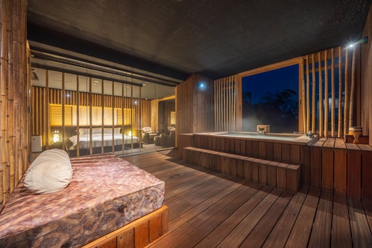 第3位 雲(くも)|金乃竹 塔ノ澤 金乃竹 塔ノ澤の最上階4階、角部屋に位置するお部屋。4階客室専用の香り高い最上級檜を使用した露天風呂に加え、広々としたテラスには暖炉を備え、客室・寝室の双方から行き来できる遊び心ある設計が特徴です。