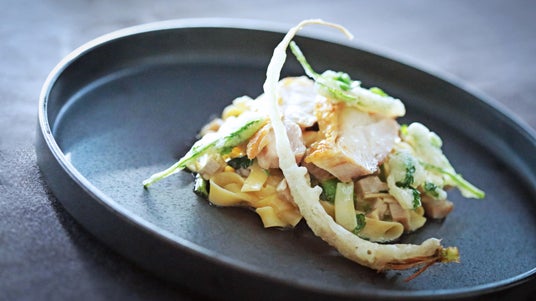 比内地鶏のラグーに雪中ネギを合わせ、旨味と香りを引き立てたタリアテッレのパスタ。