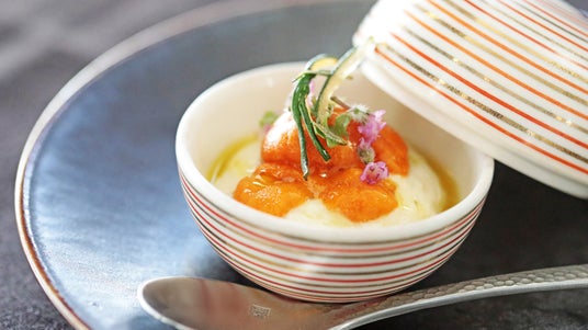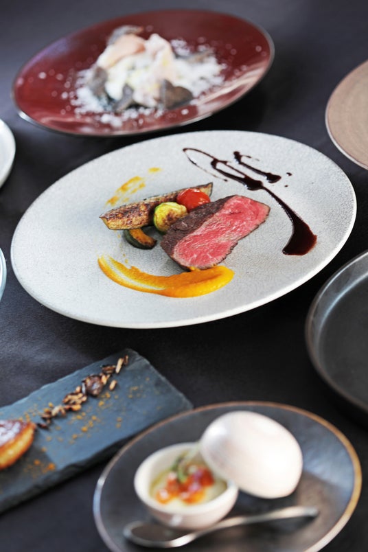 A5ランク黒毛和牛ヒレ肉を炭火で香ばしく焼き上げ、しっとりと上品な食感に仕上げました。雪下人参は雪の下で甘みを蓄えたやさしい旨味が特長で、旬菜とともに彩りと食感のアクセントに。マディラワインを煮詰めた深みのあるソースで、肉の旨味を引き立てます