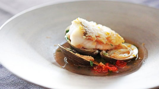 旨味の強い十豚(じゅっとん)を香ばしく焼き上げ、芹の風味を生かしたソースで仕上げた一皿。