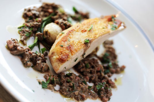 ● 比内地鶏のむね肉のしっとりソテー 砂肝とレバーのソース ¥4,000
