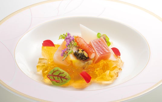 海鮮ジュレ七宝盛り 柚子の香り キャビア添え金箔飾り