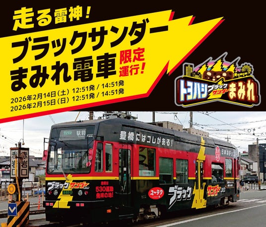 バレンタイン限定ブラックサンダーにまみれた特別な電車が、期間限定で運行します!豊橋鉄道市内線(市電)において、ブラックサンダー特別電車が限定運行します。