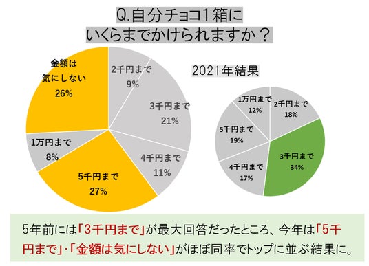 →自分チョコにかける金額は「金額は気にしない」・「5千円まで」がトップにならぶ一方、 贈るチョコにかける金額は「3千円まで」が半数以上を占めていることから、高級チョコは『自分のご褒美』として購入される方が多いことがわかります。