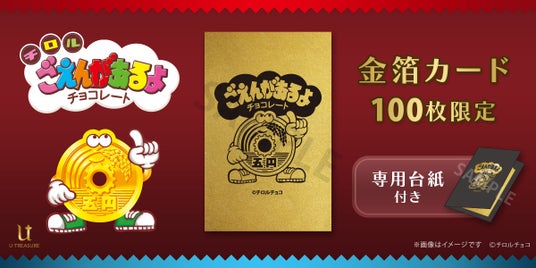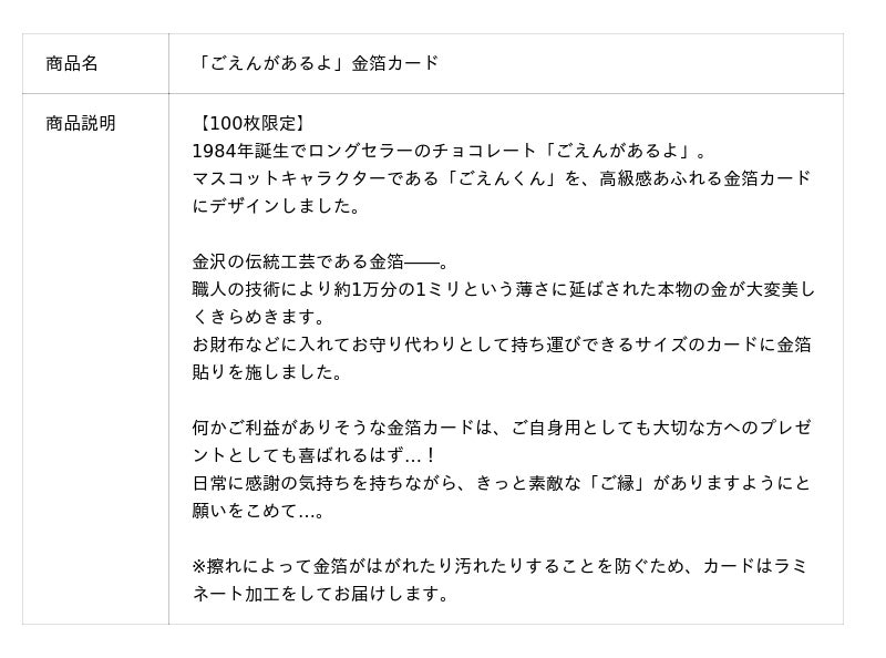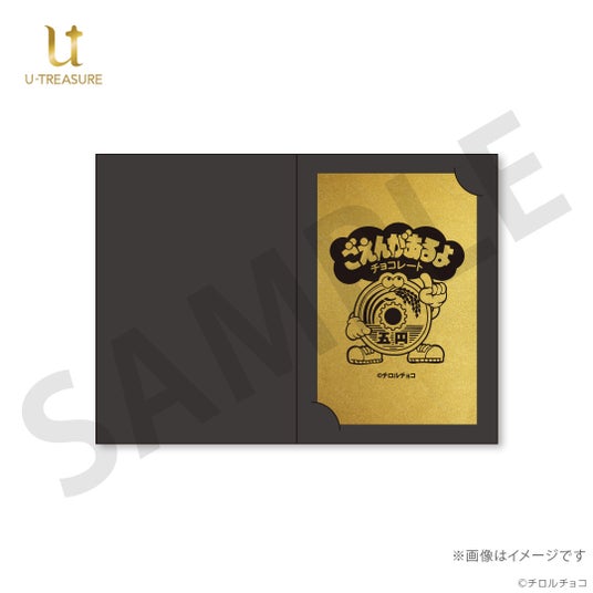 このたびの新作は、チロルチョコ株式会社のロングセラー商品「ごえんがあるよ」の「ごえんくん」をデザインした金箔カードです。お財布などに入れてお守り代わりとして持ち運びできるサイズのカードに金箔貼りを施しました。