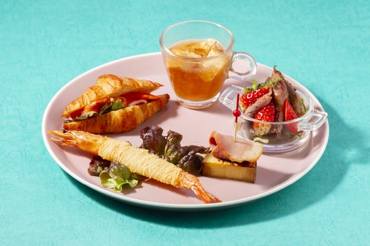 海老のカダイフ巻きやオニオングラタンスープ、苺のサラダなど、素材と味わいのコントラストを楽しめるセイボリーをラインナップ。