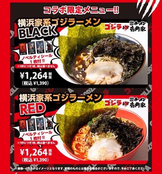 コラボ期間中は、ゴジラをモチーフにしたラーメン「横浜家系ゴジラーメンBLACK」や「横浜家系ゴジラーメンRED」を提供します。また、コラボを記念した限定グッズの販売および、コラボラーメンをご注文いただいた方に限定のオリジナルノベルティのプレゼントを実施します。