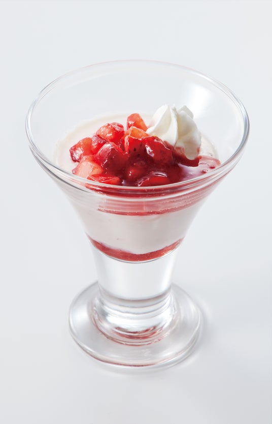 デザートも紅と白のコントラストで。なめらかな口どけのパンナコッタに甘酸っぱい苺ソースを合わせた、季節のデザートならではの華やかな味わいが楽しめる一品です。