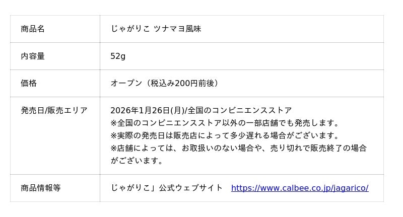 カルビー株式会社(本社:東京都千代田区、代表取締役社長兼CEO:江原 信)は、独自の製法で“はじめカリッとあとからサクサク”の心地よい食感が楽しめる「じゃがりこ」ブランドから、おにぎりの定番フレーバーを再現した『じゃがりこ ツナマヨ風味』を2026年1月26日(月)から全国のコンビニエンスストアで期間限定発売します(なくなり次第、終了)。