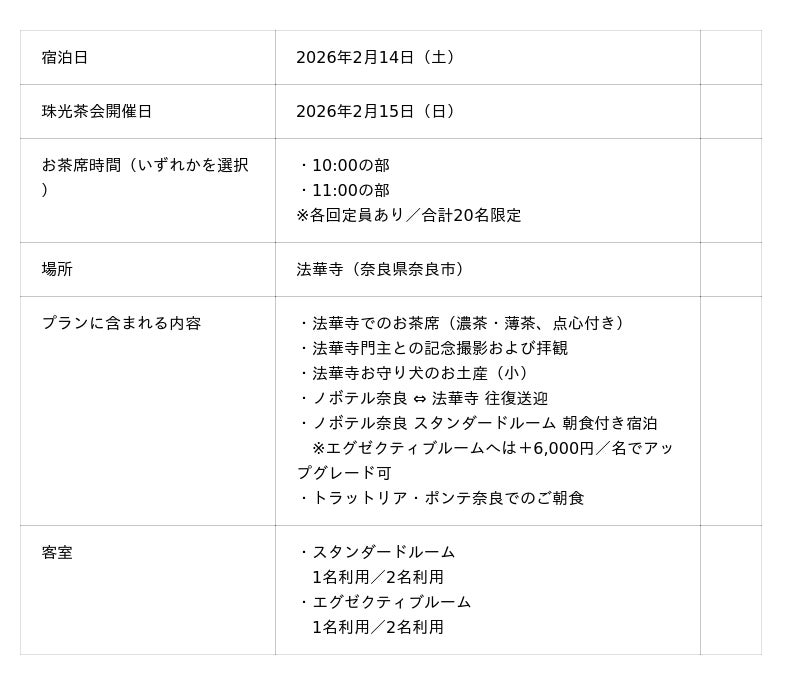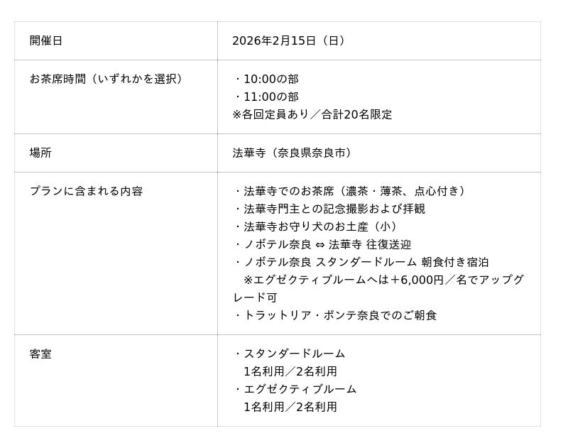 ノボテル奈良(所在地:奈良県奈良市)は、2026年2月15日(日)に開催される「珠光茶会」にあわせ、奈良の歴史と茶の湯文化を五感で体験できる「珠光茶会 宿泊プラン」を、人数限定で販売いたします。