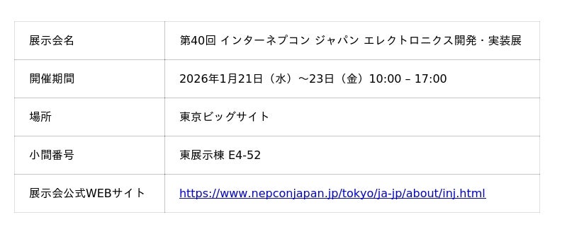第一実業株式会社(本社:東京都千代田区、代表取締役 社長執行役員:船渡雄司、以下「当社」)は、2026年1月21日(水)から23日(金)までの3日間、東京ビッグサイトで開催される「第40回 インターネプコン ジャパン エレクトロニクス開発・実装展」に出展いたします。