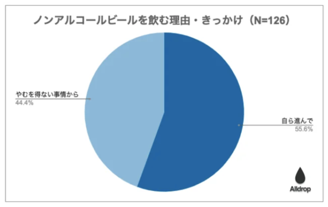 弊社が実施した調査でも、ノンアルコールビールを飲む習慣のある回答者のうち55%が、「お酒を飲まずに取り組みたいことがある」といった "積極的選択" としてノンアルコールビールを飲んでいることがわかりました。(2022年11月4日~6日に男女247名にインターネット調査、https://prtimes.jp/main/html/rd/p/000000097.000071062.html)