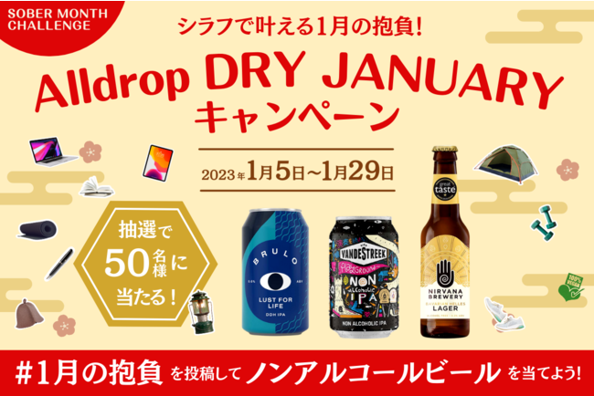 2023年1月29日までに「#1月の抱負」をSNSで発表してくださった方の中から、抽選で「Dry January」におすすめのノンアルコールビールをプレゼント! Alldropメンバーも抱負実現へ向けて1ヶ月シラフで走ります!その模様は随時インスタライブで配信!新年のスタート1月に夢中で何かに挑戦してみませんか?達成した時の特別な気持ちをみんなでシェアしましょう!みなさんのご応募お待ちしています!