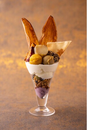 鹿児島から直送のさつま芋たちは、一度焼き芋にしたものをペースト状にし、使用しております。カリっとした食感がうれしい金時芋棒やたっぷりのごまをまとった胡麻さつまも入れました。あっさりミルクと濃厚バニラの2種類のアイスとの相性も抜群です。グラスの底までお芋の美味しさを詰め込みました。