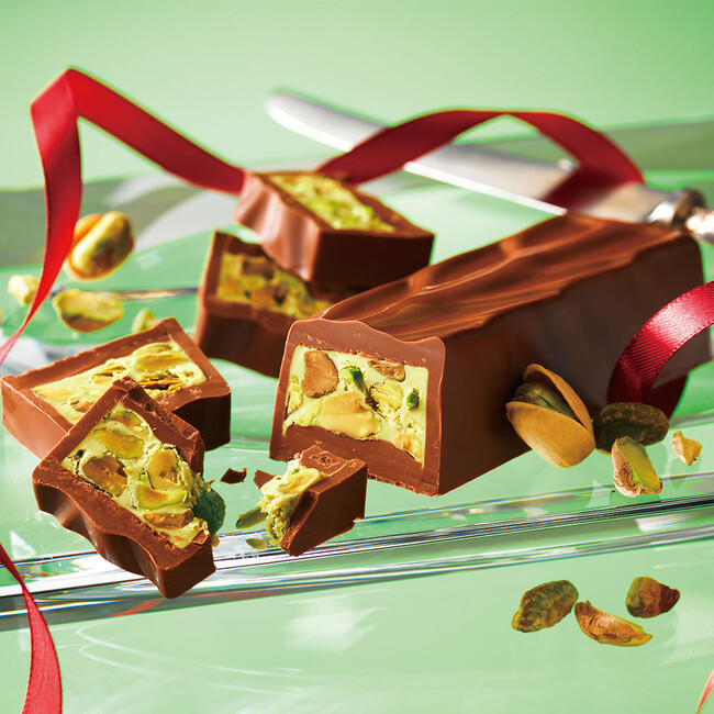 ピスタチオのペーストと、アーモンド・ヘーゼルナッツのペースト、さらにピスタチオクランチをコクのあるミルクチョコレートに加え、表面にもピスタチオクランチをまぶしました。香ばしいピスタチオの味わいの後に、ナッツの旨みとミルクチョコレートのコクがまろやかに広がります。