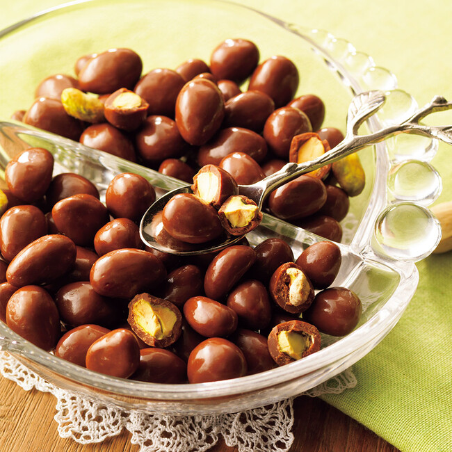 カリフォルニア産のピスタチオを、ミルクチョコレートでひと粒ずつコーティングしました。 ピスタチオ特有の食感と旨みが、すっきりとした味わいのチョコレートにベストマッチ。ついつい手が伸びてしまうおいしさです。