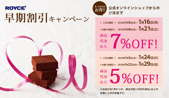 バレンタインデー時期よりもお早めのご注文・お届けでお得になるキャンペーンを開催中です。ぜひご利用ください。