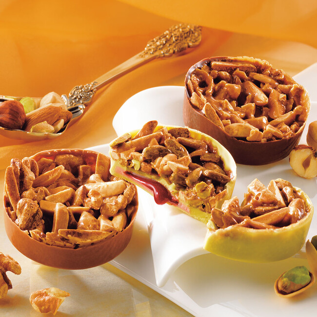 キャラメルでコーティングしたナッツ類を焼き上げたお菓子「フロランタン」をロイズのレシピでアレンジし、チョコレートの器にのせました。アーモンドと「ピスタチオ」、「くるみ」、「ヘーゼルナッツ」が香り立つ、3つの味わいの詰め合わせです。