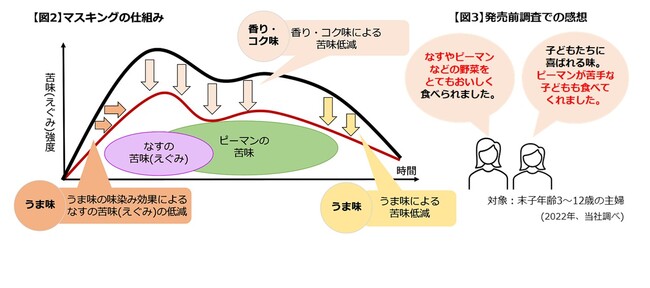 また野菜の苦みやえぐみをマスキングし、やわらげる当社独自技術(図2参照)を活用していますので、なすやピーマンが苦手な子どももおいしく食べられる麻婆茄子を手軽に作ることができます(図3参照)。