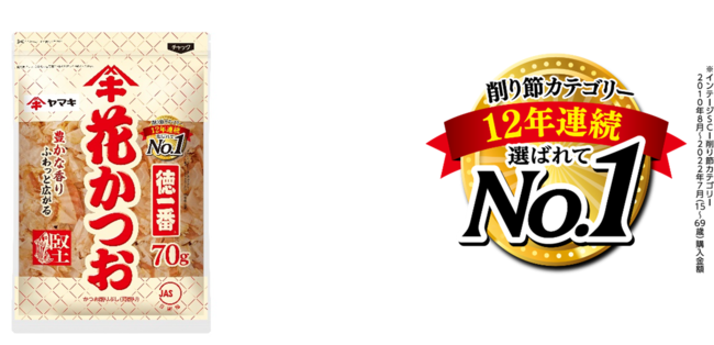 ヤマキ株式会社(本社:愛媛県伊予市 代表取締役社長:城戸善浩)は「『徳一番(R)』花かつお」が削り節カテゴリーにおいて、12年連続で購入金額No.1を獲得したことをお知らせします(※)。これを記念して、「No.1」アイコンが付いたパッケージにリニューアルしました。