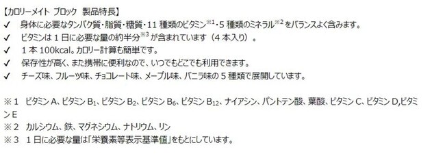 1983 年 4 月に誕生したカロリーメイトは、5 大栄養素(タンパク質、脂質、糖質、ビタミン、ミネラル)をバランスよく含み、身体に必要な栄養素を手軽に摂れる「バランス栄養食」です。ブロック・リキッド・ゼリーの3タイプをラインアップし、多忙な学生やビジネスパーソンが朝食を食べられないときや、スポーツ時、勉強・仕事中など、幅広い年代の方々に様々なシーンで利用されています。