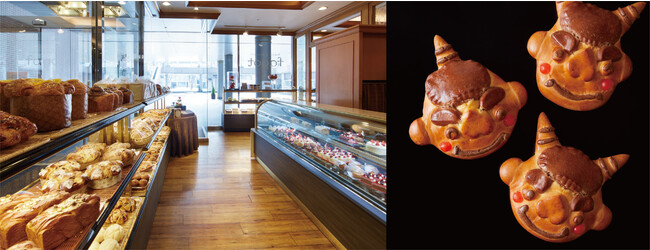 1階の「ベーカリー&パティスリー ファゴット」では、新商品のスイーツ恵方巻き「恵方巻きロール」と、鬼の顔をかたどった「鬼パン」を販売いたします。「恵方巻きロール」は、ホテルパティシエが作るロールケーキ。ふわふわのロールケーキを、竹炭を練り込んだ真っ黒なクレープで包み込み恵方巻きに見立て、生クリームとイチゴ・キウイ・ブルーベリーなどのたっぷりのフルーツを贅沢に巻き上げています。「鬼パン」は、コミカルで可愛らしい鬼の顔をかたどったミルクとチョコレートの生地に、カスタードクリームを包み込んで焼き上げました。一つ一つ丁寧に焼き上げているので、それぞれの鬼の表情が少しずつ違っており、どの鬼にするかチョイスするのも楽しいパンです。