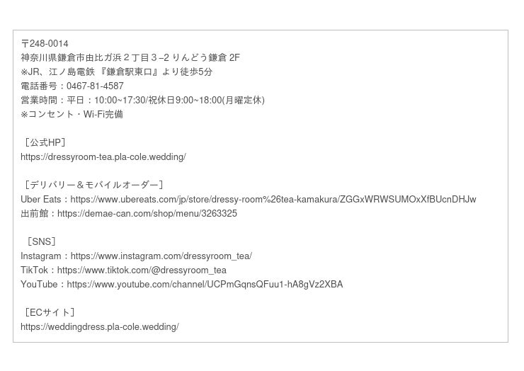 オフラインの環境や事業にも力を入れており、2022年1月に、JR横浜タワーにベースオフィスを開設。2022年3月に、DRESSY ROOM(女性に魔法をかける空間店舗)を横浜、鎌倉に2店舗目となるお花とドレスと紅茶のお店DRESSY ROOM &Teaを開業いたしました。全国、全世界に展開し、横浜から世界へ、世界中で愛されるサービスを展開してまいります。