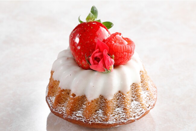 ホワイトチョコレートでコーティングした紅茶フレーバーのクグロフにベリーとエディブルフラワーを飾り、華やかに仕上げました。