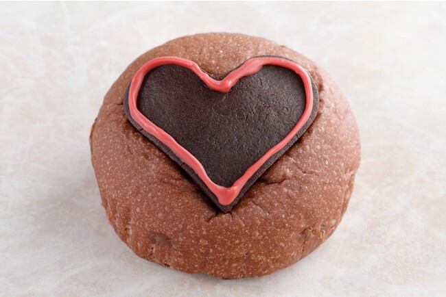 オレンジピールを練り込んだココア生地の中にチョコレートクリームをたっぷり詰め、ハート形のクッキーを乗せて焼き上げました。