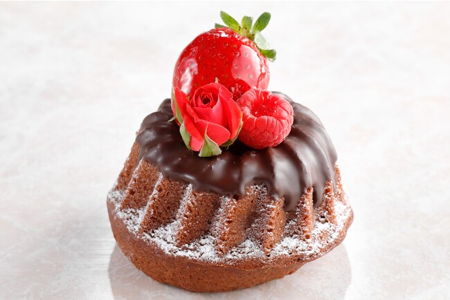 スイートチョコレートでコーティングしたチョコレートクグロフにベリーとエディブルフラワーを飾り、華やかに仕上げました。