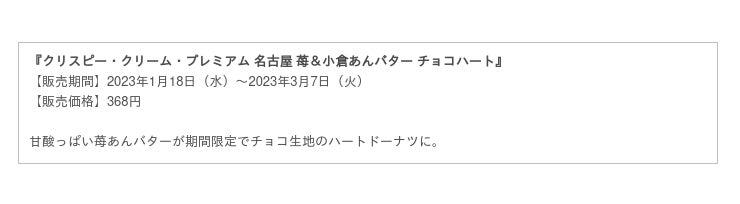 クリスピー・クリーム・ドーナツ・ジャパン株式会社(本社:東京都渋谷区、代表取締役社長:若月 貴子、以下:KKDJ)は、ジェイアール名古屋タカシマヤ店限定のバレンタイン施策として、現在販売している『苺&小倉あんバター』ドーナツがハート型のチョコ生地に変わる『クリスピー・クリーム・プレミアム 名古屋 苺&小倉あんバター チョコハート』を、2023年1月18日(水)より期間限定で販売します。