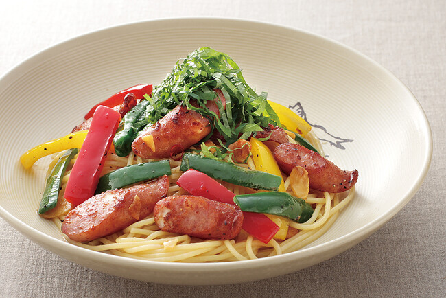 ‐ソーセージと青じそ、ニンニク、唐辛子のスパゲティ‐