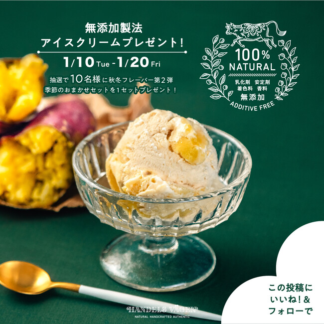フレックス株式会社(本社:東京都港区、代表取締役社長 藤崎 孝行)が運営する無添加クラフトアイスクリームブランド「HANDELS VAGEN(ハンデルスベーゲン)」は、2022-23年秋冬の季節限定フレーバー第2弾を2023年1月13日(金)より公式オンラインストアにて販売開始するとともに、発売を記念したプレゼントキャンペーンをインスタグラム公式アカウントにて実施いたします。