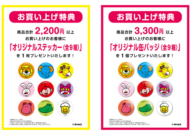 会期中、会場にて「たべっ子どうぶつ」関連商品を1会計2,200円(税込)以上お買い上げのお客様に「オリジナルステッカー(全9種)」を1枚プレゼント!また、1会計3,300円(税込)以上お買い上げのお客様には「オリジナル缶バッジ(全9種)」を1個プレゼントいたします!