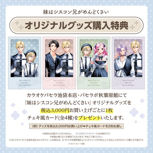 カラオケパセラ池袋本店・パセラボ秋葉原館ではオリジナルグッズを税込3,000円お買い上げごとに、チェキ風カード(全4種)をランダムで1枚プレゼントいたします。