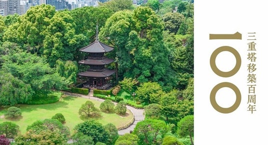庭園のシンボルである三重塔「圓通閣」は、1925年に東広島から移築され、2025年に100周年を迎えました。国の登録有形文化財に指定され、都内に現存する三古塔の一つです。