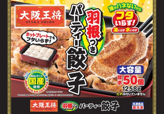 もちもちの皮、ぱりぱりの羽根、そしてジューシーな中具。2026春夏では、餡をよりジューシーに肉汁を楽しめる餃子へリニューアルいたしました。イートアンドでは冷凍点心の肉汁製法に関して特許を取得しています。溢れる肉汁がSNSでも話題の『肉汁爆弾餃子』、冷凍小籠包市場の1/3以上のシェアを占める『小籠包』など、自社独自の特許製法を活用した商品は人気です。この製法を活用し、今回のリニューアルでは、肉汁量1.2倍に、お肉の旨みたっぷり肉汁をとじこめました。また、鶏肉と豚肉の旨みが詰まったエキスを新配合し、香味野菜と肉の旨みを活かした味わいに。皮もフタいらずでも「もっちりコシのある」皮へ改良しています。『羽根つきスタミナ肉餃子』は、おろしにんにくを15%増量、牛脂のコクが肉の旨味をひきだすことでリッチな味わいに。にんにくと岩塩でやみつきに。にんにくのパンチと肉汁は、『羽根つきスタミナ肉餃子』だけの魅力です。水・油いらず、そしてフタいらず(特許取得)、フレーバーのバリエーションを拡大して様々なお客様向けに提案をしてきました。大阪王将の冷凍餃子が登場して30年以上、今期の羽根つき餃子シリーズの売上高予測は約197億円に。(※)