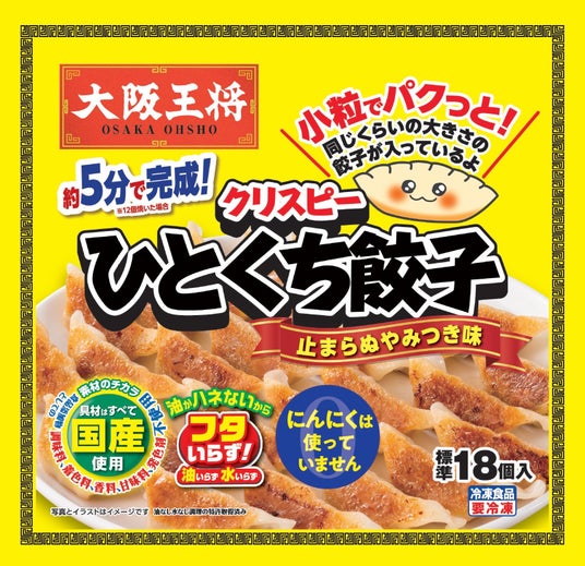 【特徴】皮はパリッとクリスピー、ニンニク不使用の小粒タイプの餃子です。油・水・フタいらずで約5分で完成(※12個調理の場合)。お弁当にもピッタリです。