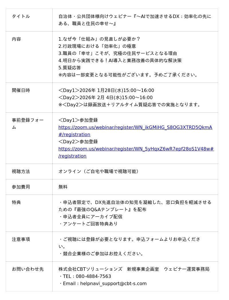 CBT・IBT試験等の試験運営業務をメイン事業とする株式会社CBTソリューションズ(本社:東京都千代田区、代表取締役社長:野口功司)は、2026年1月28(水)・2月4日(水)の2日程にて自治体・公共団体様向けの無料ウェビナー『~AIで加速させるDX:効率化の先にある、職員と住民の幸せ~』を開催いたします。