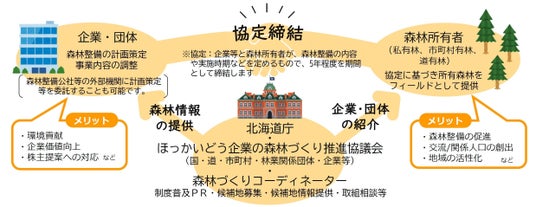 北海道では、環境保全に関心があり、SDGsやCSR活動等に取り組む意欲のある民間企業・団体と、フィールドを提供する森林所有者とのマッチングを行う「ほっかいどう企業の森林づくり(※)」制度により、企業等と連携した森林づくりを推進しており、2007年度からこれまでに延べ84件の協定が締結され、1,000ha以上の森林が整備されております。
