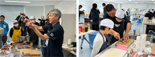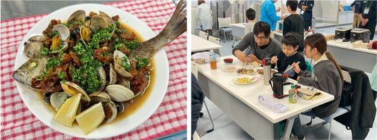 下処理を終えた後は、さばいた魚を使って調理を行いました。アイゴは、新鮮なものならではの引き締まった身を活かし、お刺身と天ぷらに仕上げ、特に、中榮さんおすすめの生姜醤油で味わうアイゴは、素材のうま味を感じられる一品でした。また、参加者が自分で選んだ魚については、煮付けまたはアクアパッツァのいずれかを選んで調理。煮付けは、魚がやわらかくなるまで丁寧に火を入れ、生姜の香りが全体に行き渡る仕上がりとなりました。アクアパッツァは、ニンニクとオリーブオイルの香りにドライトマトの風味が加わり、魚のおいしさを引き立てる料理です。調理後は、完成した料理を味わい、自分でさばき、調理した魚のおいしさを実感する時間となりました。慣れない作業に苦戦しながらも、参加者同士で声を掛け合い、終始和やかな雰囲気の中で調理が進みました。完成した料理を味わう場面では、「料理の幅が広がった」「美味しい魚を調理できて楽しかった」といった声も聞かれ、自ら選び、調理した魚のおいしさを実感する時間となりました。