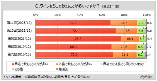 ワイン飲用者のうち、直近1年間に「自宅で飲むことの方が多い」と回答した人は67.5%です。2021年調査以降減少し、コロナ禍前の2019年調査時と同程度の水準となっています。
