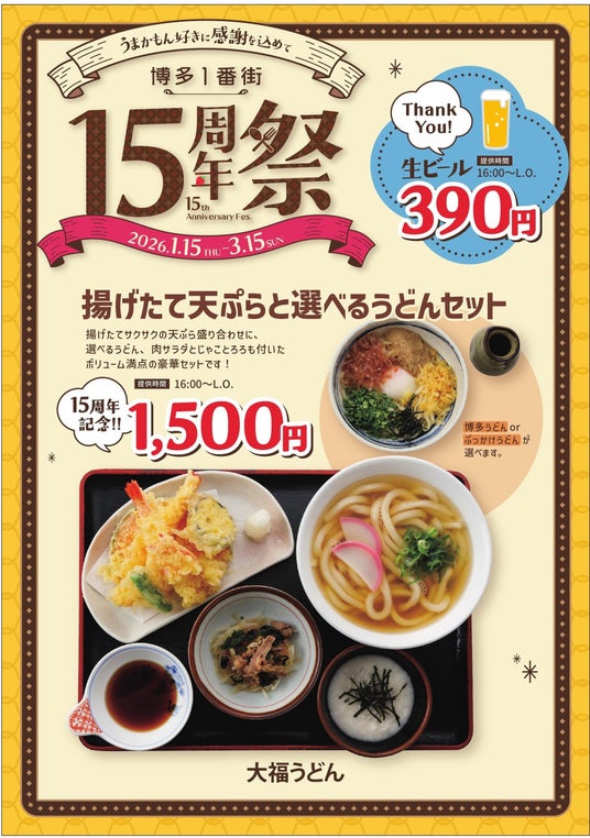 ●『15周年』にちなんだ1,500円均一の特別メニュー提供!●『Thank you』の想いを込めた390円のアルコールドリンク提供!