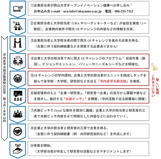 これらの取組のひとつに、企業等と大学の担当がタッグを組み、共に考え、ビジョンを形成し、学内活動を通じてマッチングを行い、プロジェクトを創り上げていく産学共創活動のひとつ「岡山大学オープンイノベーションチャレンジ」(略称:岡大OIチャレンジ)を実施しています。