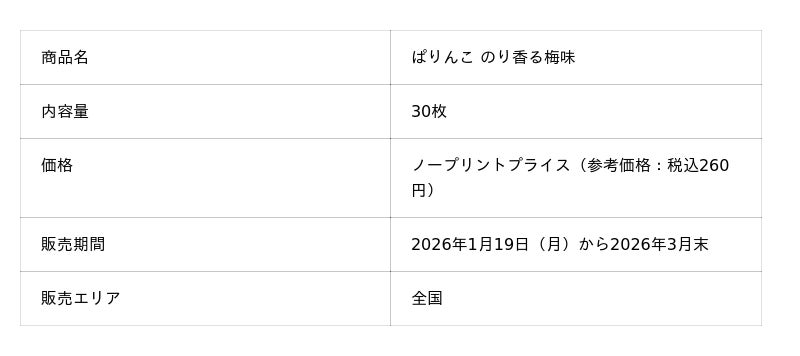三幸製菓株式会社(所在地:新潟市北区)は、春の訪れを感じさせる爽やかな梅の味わいが楽しめる「30枚 ぱりんこ のり香る梅味」を、2026年1月19日(月)から2026年3月末までの期間限定で全国発売いたします。