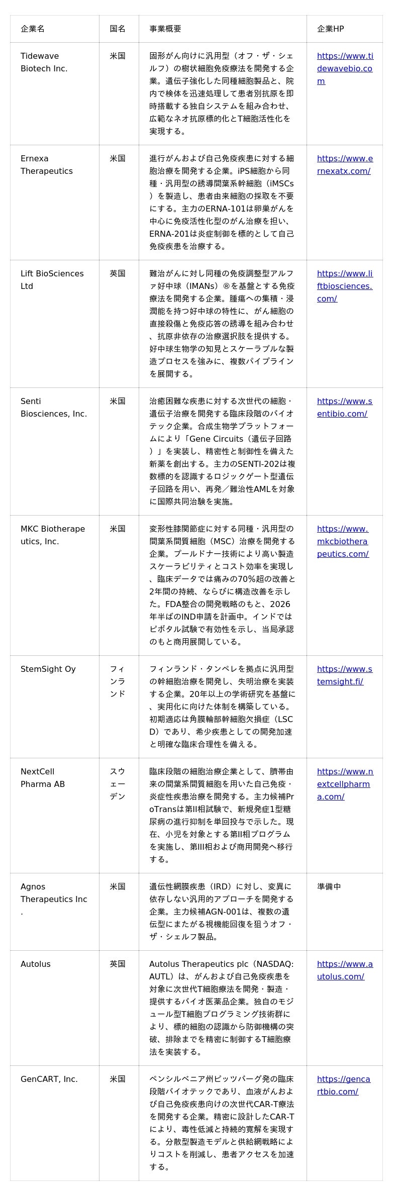 この度は厳正な審査の結果、再生医療分野の海外企業10社を選抜しましたのでお知らせします。